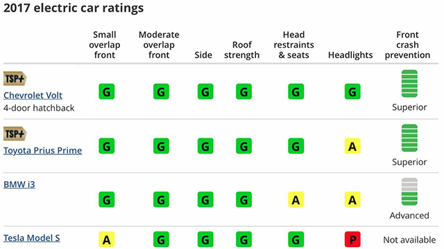 所以看回Model S的IIHS成绩,实际上它的车顶强度测试是拿到了Good的成绩,然而最后没能成功获得TSP+的成绩原因在于正面25%偏置碰撞只能拿到了Acceptable,儿童座椅易用性差和头灯照明方面表现也不是很理想。值得一提的是,这是Model S第一次参加IIHS的碰撞测试,而新能源车型中雪佛兰的Volt是以全优的成绩获得TSP+的最终成绩。