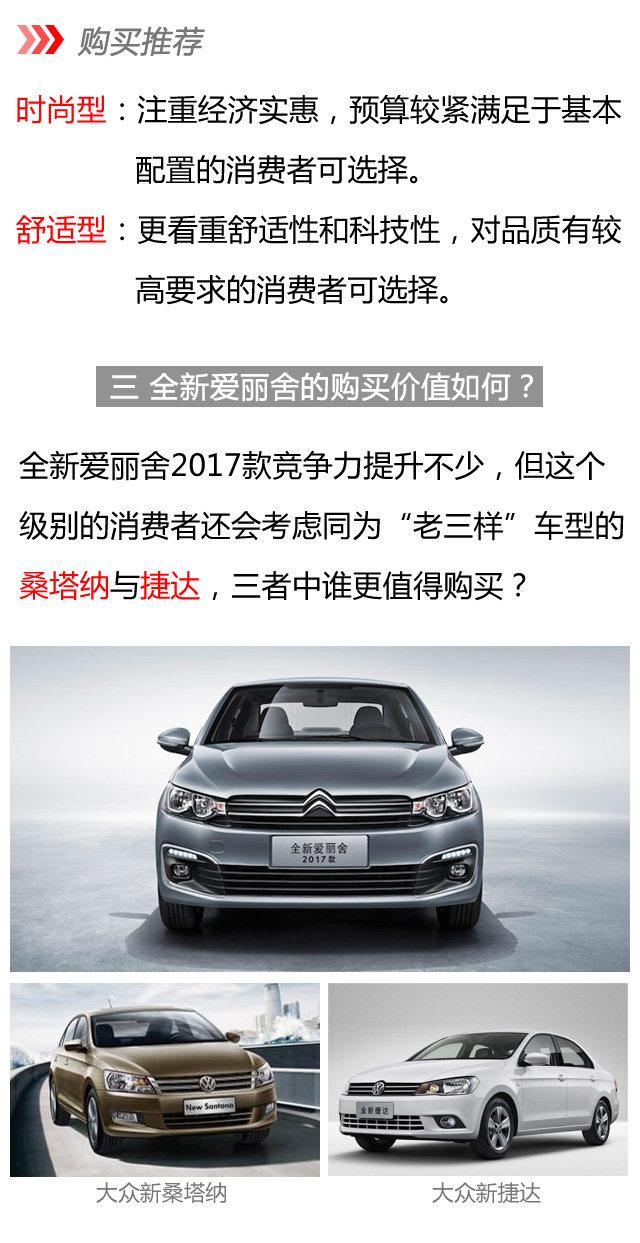 总结:全新爱丽舍2017款推出后确实优点更加明显,品质高、空间大并且配置齐全,与竞品在经过一番对比后发现它确实有着更高的性价比。新款上市竞争力无疑提升幅度不小,我们理应对其未来的销量有着更多的期许。