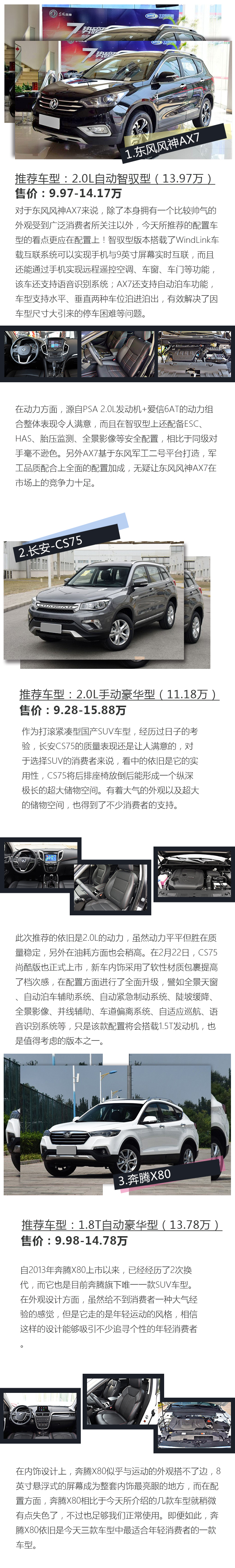 8-15万应该选什么样的SUV?其实可选的车型非常多,你可以追随大众的消费口味,去选择那几款热卖车型。你也可以去考虑近期那几款新上市的爆款SUV车型。但就今天所介绍的三款SUV而言,虽然在大众的认知度、热度方面并不高,但它们都算得上是一台好车。如果你是一名年轻消费者,相信造型更运动的奔腾X80是你的菜,不过需要注意的是X80在配置搭配合理程度上并不高,建议选择配置更高的车型;如果你是个体商户,你可以考虑CS75,空间实用性高,装货能力一流,只是CS75的悬架调校较为硬朗,所以在舒适性方面有待加强,而且油耗会稍高;如果你的购车用途是家用,相信AX7便是最好的选择,外观大气、配置够高,无论是舒适性还是车型的耐用程度都值得肯定。