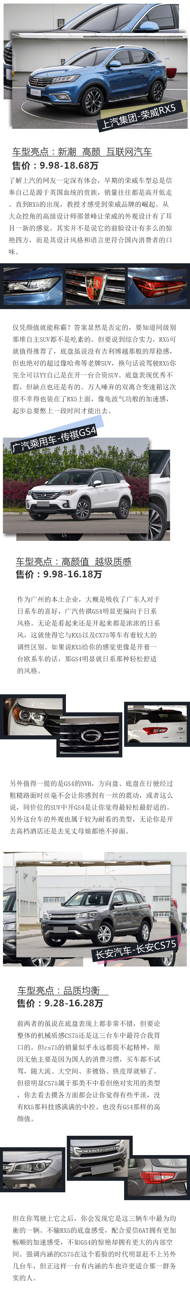 【总结】RX5拥有越级的底盘质感和科技配置,对于那些最求新鲜事物的买家无疑非常具有诱惑力;而传奇GS4继承了日系车的优良传统无论是乘坐还是驾驶都是一副放松的状态;最后也是教授最为喜爱的长安CS75,虽说相比起同级竞争对手在设计、配置上稍显落后,但出色的机械品质定能打动追求驾驶质感的你。上述的三款车的销量在10万级SUV中都处于领先地位,更大的销量意味着更更多人的认可。