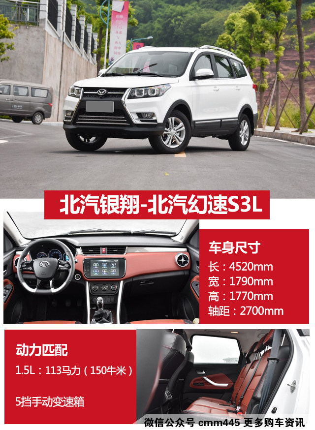 点评:北汽幻速S3L作为S3的升级版车型,不仅外观比例更加协调了,身型也更加流畅是个颜值不错的SUV。另外配置的丰富程度也是相当惊喜的,标配了车身稳定系统和上坡辅助、电动天窗、倒车影像等配置。最有亮点的是9英寸中控大屏,不仅集成了导航多媒体等功能,还支持手机互联。另外这也是款7座布局的SUV,更适合家庭用户使用,内饰做工用料水准也营造了很豪华的感觉,简直就是三四线城市人民的最爱。