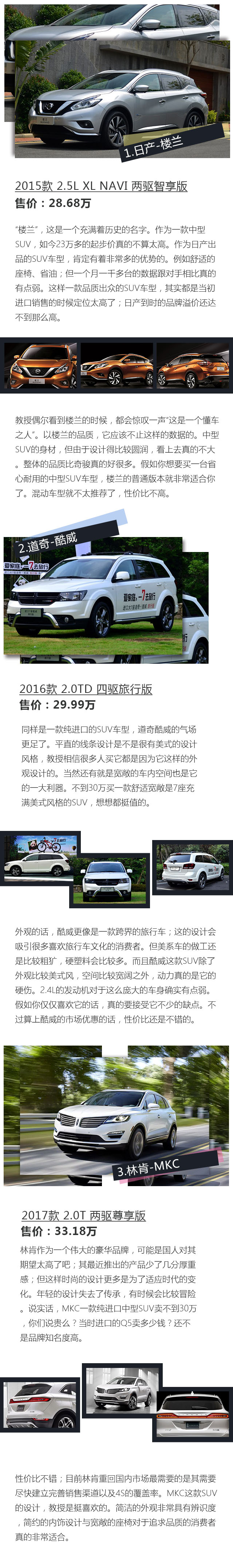 总结:肯定会有人说,教授你今天介绍的车型都有着这样那样的问题,真的不值得买么?不是的,例如楼兰这款SUV现在就非常值得购买;如今的性价比已经不差了。MKC这款SUV,相比从前的美系车,已经有了很大的提高;例如它的设计与整体做工都很具质感;加上它进口的身份,真的不错了。而酷威,除了硬派的风格之外还有就是它宽敞的空间;进口的身份再配合市场不低的优惠,假如你追求一款进口实用的SUV车型,它会是不错的选择。