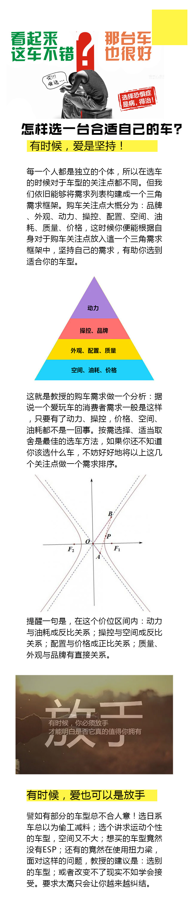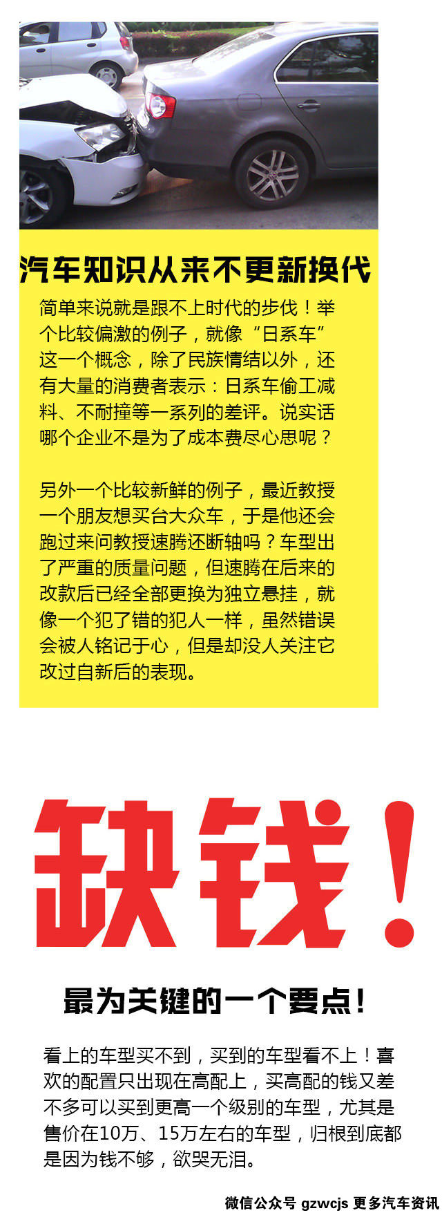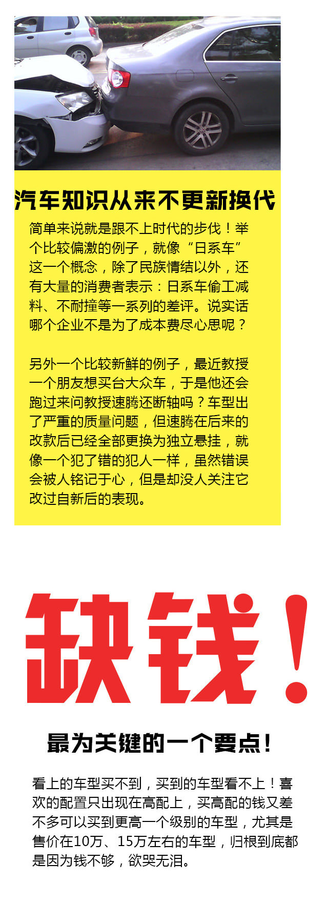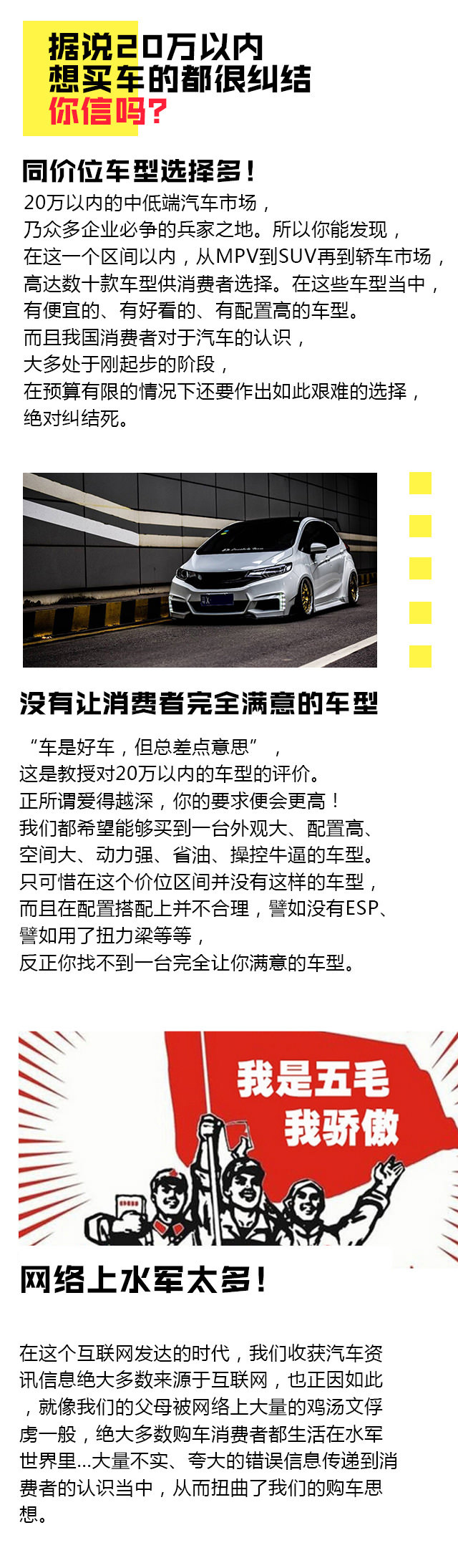 20万以内的车型选车很困难?在教授看来这是因为在这个阶段的消费者在心理上都希望能够选到一辆面面俱到、性价比超高的车型。了解自己的需求,学会区分轻重,在适当的时候学会取舍才是最快捷购车的王道。另外与其过于纠结倒不如努力工作,挣更多的钱,这样离买车还远吗?在这里教授还是要祝福你们能够早日完成自己的购车梦。
