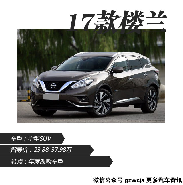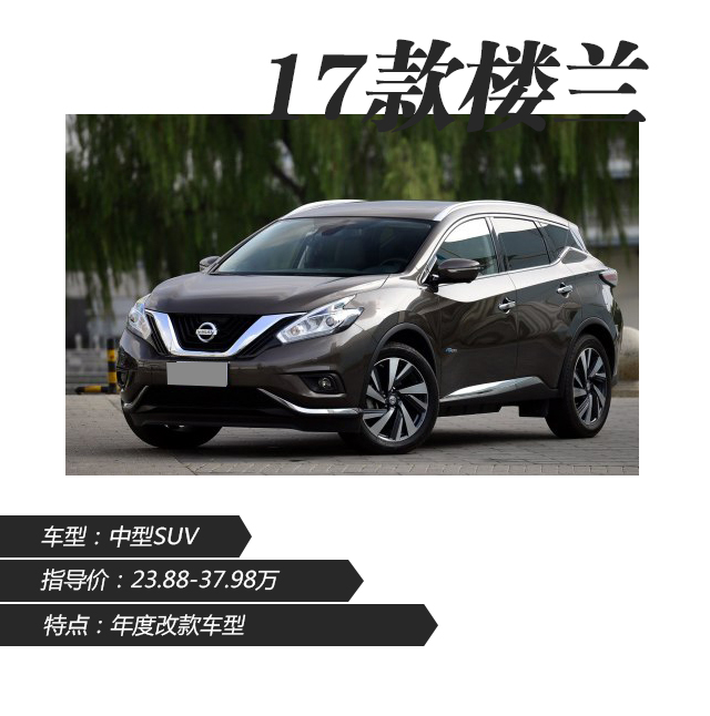 作为年度改款车型,17款楼兰共提供了6款车型,其售价区间为23.88-37.98万元。2017款楼兰新增一款混动四驱车型,进一步降低了四驱车型的入门价格。