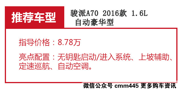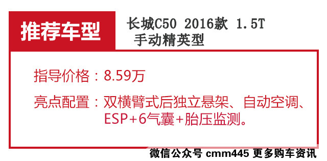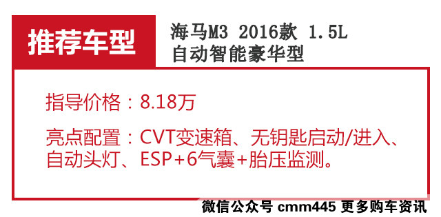 总结:作为一辆家用车,舒适安全是首要条件,其次就是空间和动力了。而本文推荐的三款车型价格相对是比较实惠的,有条件还是上顶配车型,无论是安全配置还是日常配置更为丰富,喜欢自动挡车型的朋友海马M3就是首选车型,追求大空间和配置的可以选择长城C50,追求个性外观和运动风格车型的骏派A70就很适合。