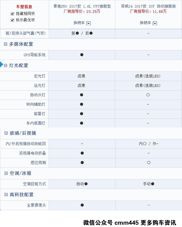 荣威i6自动旗舰版价格比景逸S50CVT旗舰型价格要贵出1.39万,但是配置上却相差甚远。相同的配置我们就不多叙述,我们来看看荣威i6缺少的配置:前/后排头部气囊、GPS导航系统、自动头灯、转向辅助灯、车内氛围灯、后视镜电动折叠、感应雨刷、自动空调、全景摄像头等。