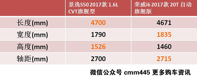 从表中数据可以看出,两车是各有各的优势,相差最大的是在高度方面,景逸S50要比荣威i6高了66mm,头部空间方面更有优势。但荣威i6在宽度上面却比景逸S50宽了45mm,横向空间表现更出色,但总的来说,相差不会太大,两车的空间表现都是自主家轿的标杆。