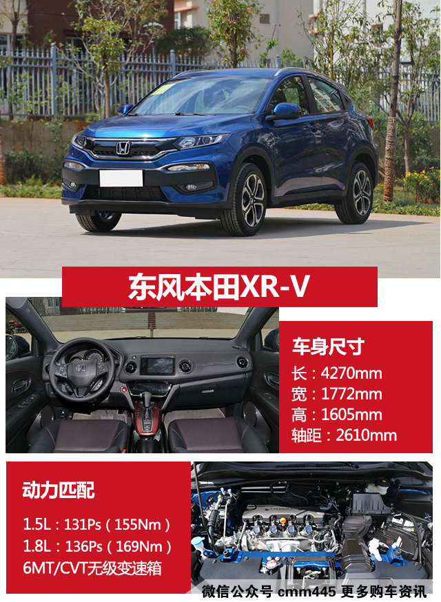 如果你在纠结XR-V和缤智的话,其实就外观来说缤智会偏柔美,而XR-V则更硬朗一些,除此之外,它们的区别不大。XR-V的身形虽然不大,但内部空间却很充裕,头部空间、后排腿部空间、尾厢空间都是相当有优势的,而且全车储物空间很丰富。动力上1.5L足够用,动力输出线性,有一定爆发力,平顺性很好。除了底盘质感偏单薄,隔音一般外,家用还是不错的选择。
