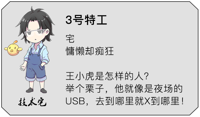 这位年轻的小哥头发蓬松,衣着随意,一样看上去就像修自行车的,大家都叫他技术宅。他是王小虎的好朋友兼得力助手,王小虎每次任务能深入敌军的关键都离不开他,但每次出糗时第一个幸灾乐祸的人也是他。
