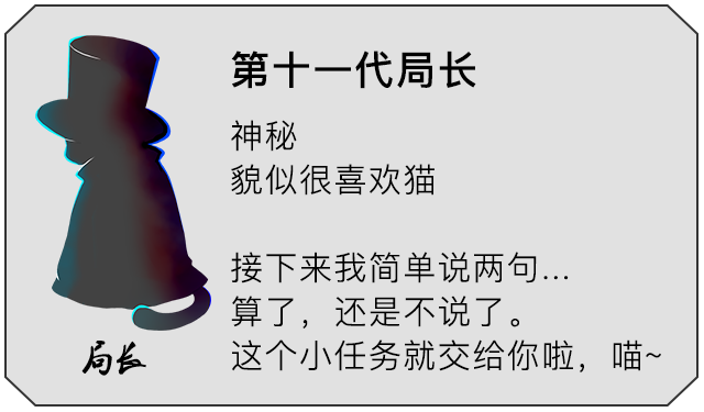 作为第十一代局长,从就任以来就没人看过他的真容,只听说他喜欢养猫。因为每次开会时,大家都只能从屏幕里看到局长带绅士帽的剪影图像,还时不时听到猫叫。
