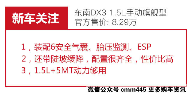 除了造型时尚外,东南DX3的配置也比较齐全,部分车型装配有全景天窗、倒车视频影像、自动头灯、前/后排头部气囊等等配置,综合到它并不高的售价,东南DX3是一款性价比较高的车型。