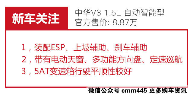 在配置方面,中华V3则显得不那么丰富了,ESP、上坡辅助等功能并没有全系标配,所以购买的时候可选择中高配车型。