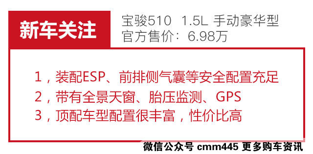 宝骏510的价格很低,但它的部分车型带有无钥匙进入与启动、ESP、上坡辅助、全景天窗、定速巡航、倒车视频影像、蓝牙等配置,综合的性价比出色。