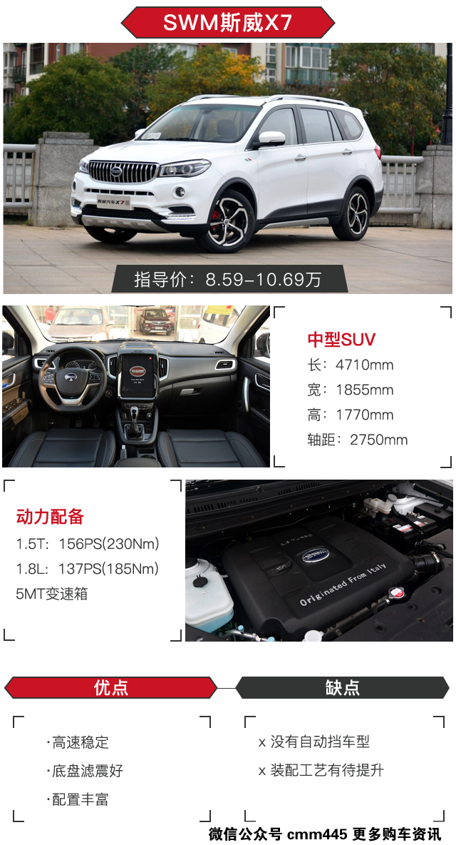 另外斯威X7本身的配置丰富,舒适性、安全性配置都不缺,动力也有1.8L和1.5T两种选择,适合不同需求的朋友选择。更推荐1.5T版本,动力储备比较充沛,底盘表现也比同价位很多自主SUV要好,虽然是前麦弗逊后扭力梁的悬挂结构,但前后排的舒适性都保持得不错,风噪的隔绝也做得比较好。