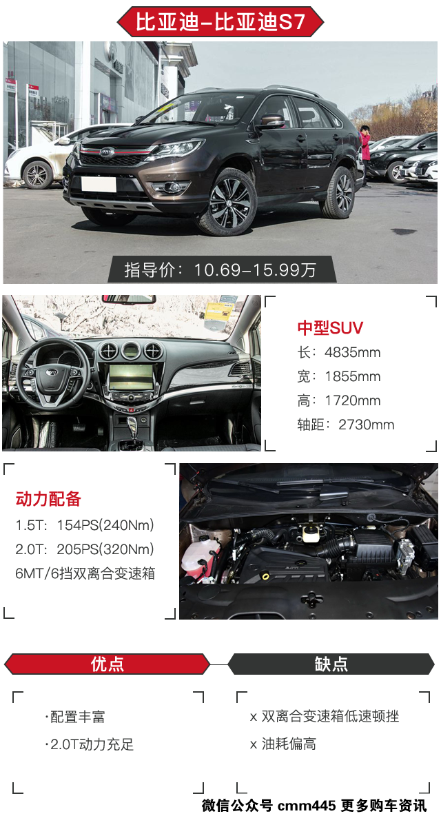 如果你是对性价比非常看重,比较务实的消费者,那么比亚迪S7是个不错的选择。依靠低定价+丰富配置的策略,比亚迪S7依旧能够拥有不少用户。外观上S7整个车身非常饱满,而内饰则看上去足够高科技,中控台造型中规中矩,不会显得凌乱,受制于成本采用比较多的硬质塑料,手感欠缺一些,不过做工有很大提升。
