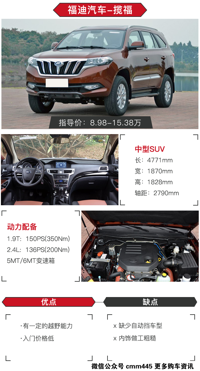 此外揽福的配置不算特别出色,中低配配置较斋,也是为了拉低入门价格做出了取舍。而乘坐空间上满足7人出行不成问题。在驾驶感受上,揽福拥有舒展的坐姿和开阔的视野,行驶时悬架表现较为稳健,高速时有较好的稳定性。如果你对一些细节和配置不太在意,而希望越野能力强一些的话,可以考虑。