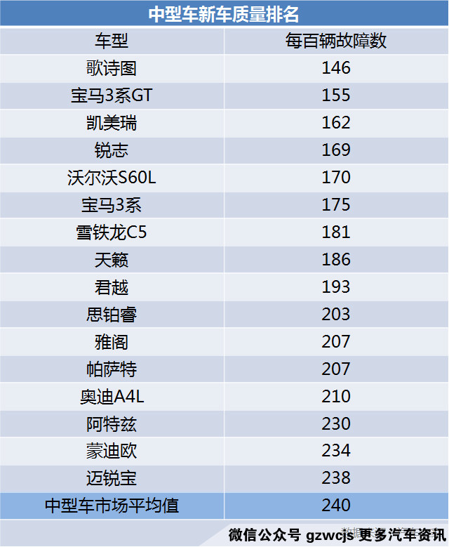 从上面的数据来看,但凡小于平均值240数值的车型,都属于质量过硬,故障率极少的车辆,其中,在前十五名中,日系车辆几乎占据一半名额,且前五名中,分别有日系的本田歌诗图,丰田凯美瑞,锐志,和德系的宝马3系GT,以及瑞典品牌沃尔沃S60L,受到的故障投诉非常之少。