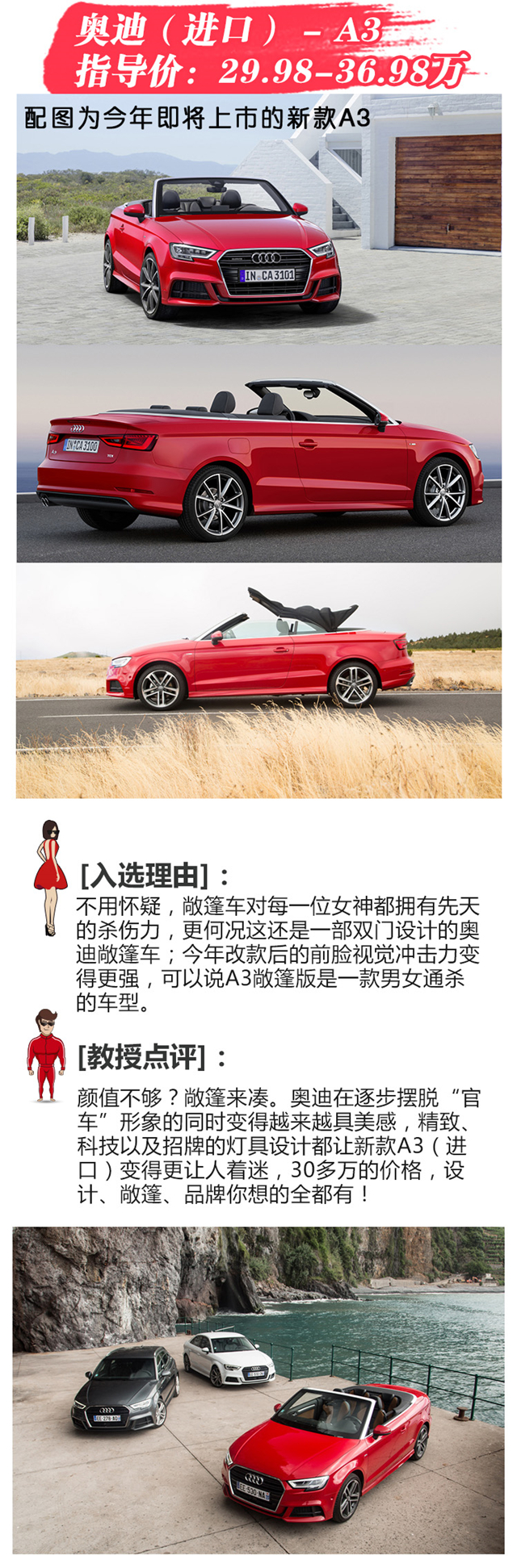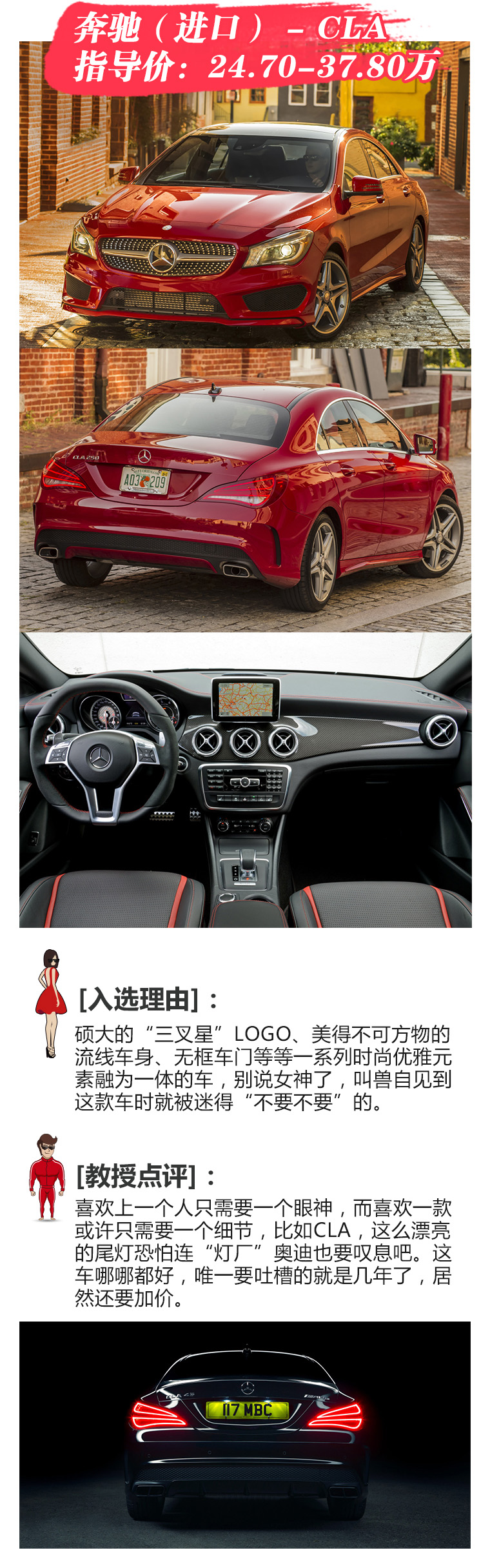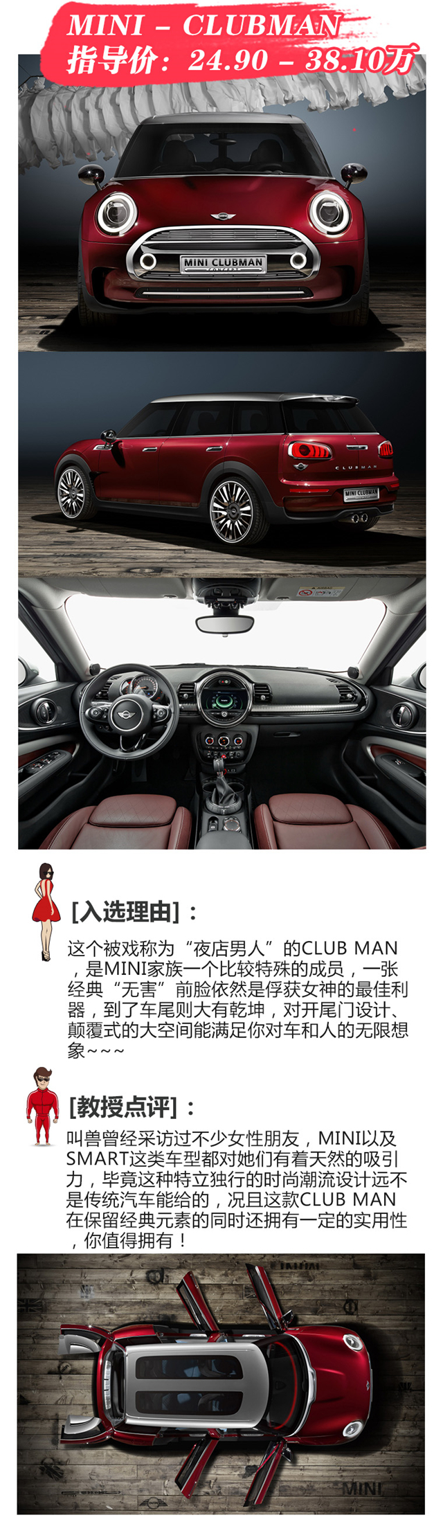 既然是给妹子选车,什么动力参数、配置空间在颜值面前一切都不重要,考虑到二狗这小子近来混得不错,于是叫兽给他推荐了以下几款车,希望他未来成功把女神变为老婆之后能吃水不忘打井人,提携我一把,或者给叫兽我介绍个小姨子傻的也是极好的。好了,废话不多说,看车: