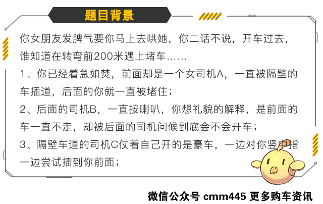 有人回答:我会关心一下A是不是没有男朋友,需要自己开车。走过去问候B是不是没有父母缺少家教的同时假装腿抖,扑倒在C的车窗那,吓C一跳。