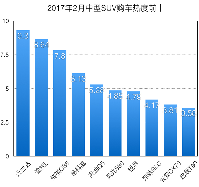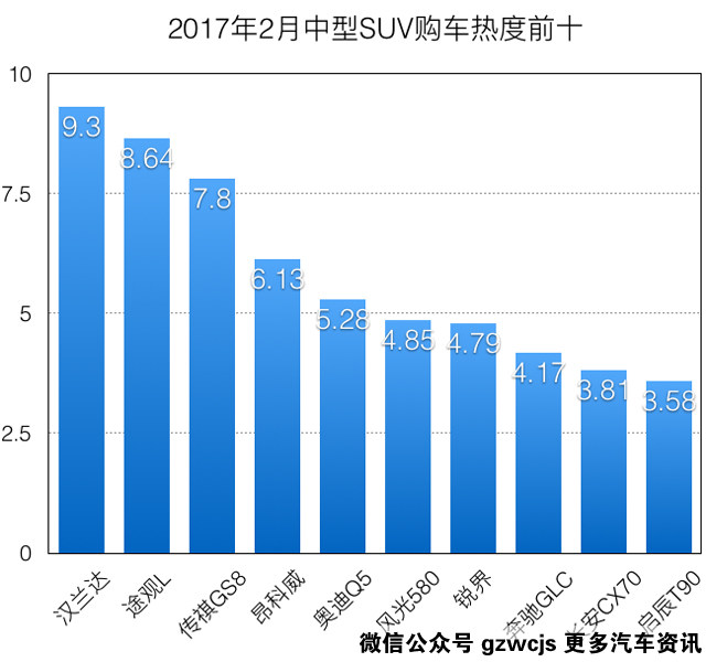 看完了3万-15万的车型后,我们再来看看20万起的中型SUV,试问中型SUV,谁不会想到汉兰达,又坐拥丰田2.0T技术,又是7座,又有着耐用耐操的品质,自然在“购车热度”里面是排行最高的,紧接着,是这么两款新车,大众途观L和传祺GS8,上市后靠着非常高的欢迎度挤上了第二第三名。