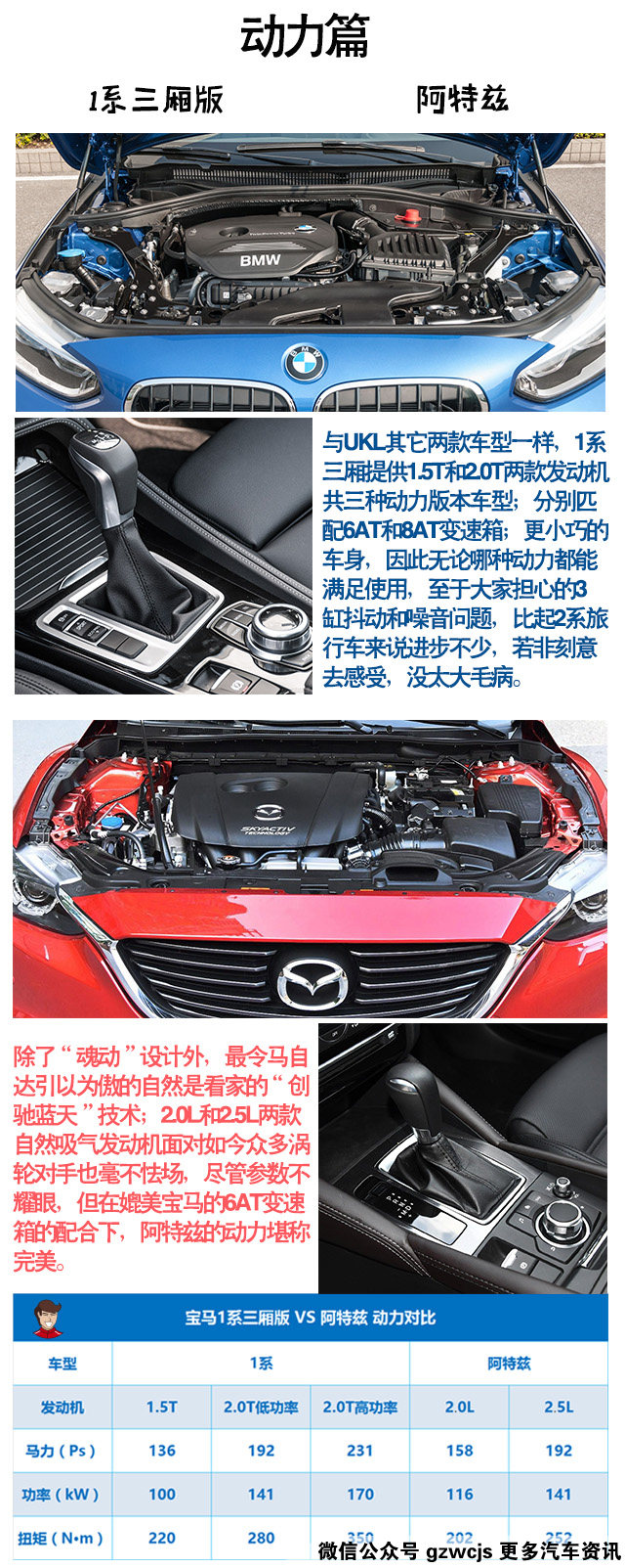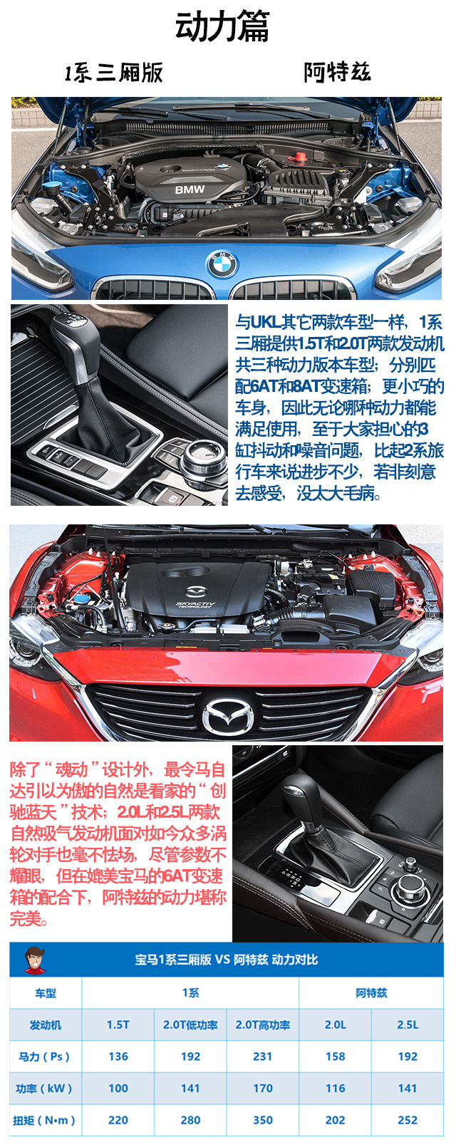 仅从参数表上看,涡轮发动机对小排量发动机的动力提升相当明显,尤其是扭矩方面,宝马的B38和B48这两台发动机的表现都非常好,丝毫不会有小排量涡轮机低扭不足的情况;而马自达的创驰蓝天发动机,在13:1的超高压缩比下,阿特兹不论是加速时间、平顺性以及油耗都处于同级顶尖水平。这一局,两者各有千秋,如果你喜欢瞬间加速的快感,无疑宝马更适合你,而叫兽个人更钟情阿特兹2.5L加速的顺畅和后劲十足的感觉。