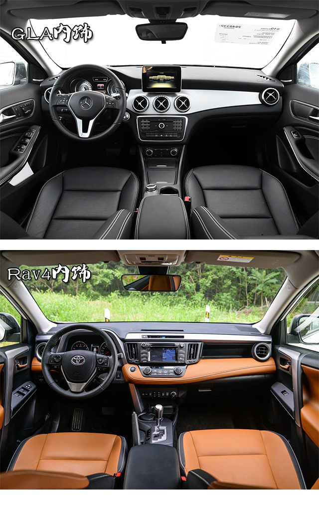 两车的外观对比意义其实并不大,双方都是多年的大品牌,在外观设计方面肯定都会有各自的理念,很难用一个客观的标准来评判。但有一个比较悬殊的对比是,顶配Rav4用的是LED大灯,而乞丐版GLA用的却是卤素大灯,说真的,26万一辆车只配卤素灯确实有点说不过去。