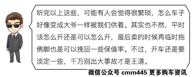 最后一点也是最重要的一点,开车时应先求稳后求快,心放宽一点,不要轻易就路怒症发作,同时遵守交通法规。这样就能减少交通事故的发生,不仅保证了自己的安全,还能大大提高车子的保值率。对一辆车的保值率影响最大的,恰恰就是有无发生过重大事故。因此,避免交通事故的发生才是最为关键的一步。