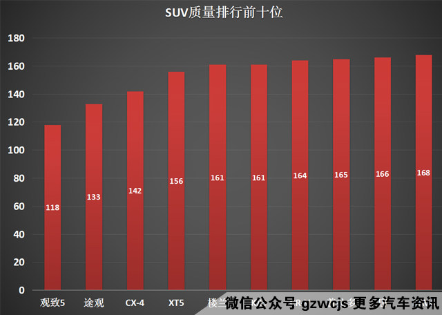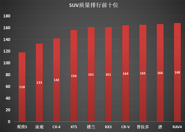夺得SUV质量排行榜第一名的居然是中国品牌(还是叫中以合资品牌?)车型 - 观致5,其实自观致问世以来就成为“叫好不叫座的”最佳代表,媒体同行或者亲身体验过的人都认为观致的车型水准并不在主流合资品牌之下,但过于自信的定价等市场因素导致其连年亏损,令人惋惜。观致究竟能走多远,谁都不知道。