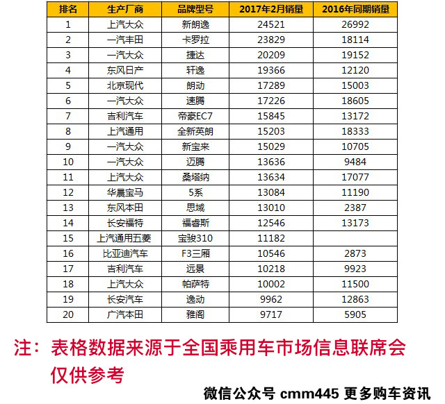 乍暖还寒百来日,又是一年三月天,眼看着阳历2017年就已经步入前四分之一的最后一个月,二月份的销量榜单也是新鲜出炉。根据乘联会公布的数据来看,上个月的销量相比较农历新年前的一月份来说稍显下滑态势,归其原因,这也是因为我们国人新年假期、年前消费等等综合原因的结果。