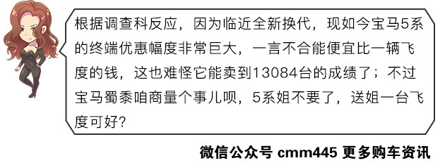 在销量榜前20名的车型中一姐一眼发现了一款豪车——宝马5系;上个月的5系宝马成为了一匹黑马,瞬间登上了销量榜第12位,成为卖得最好的豪华品牌轿车,还是一款中大型车。尽管宝马的内饰跟奔驰奥迪相比还是次了点,但是作为豪华品牌的调性,B格肯定还是有的;再加上蓝天白云的车标,那来自德国慕尼黑的巴伐利亚纯正血统确实能使人充满自信。