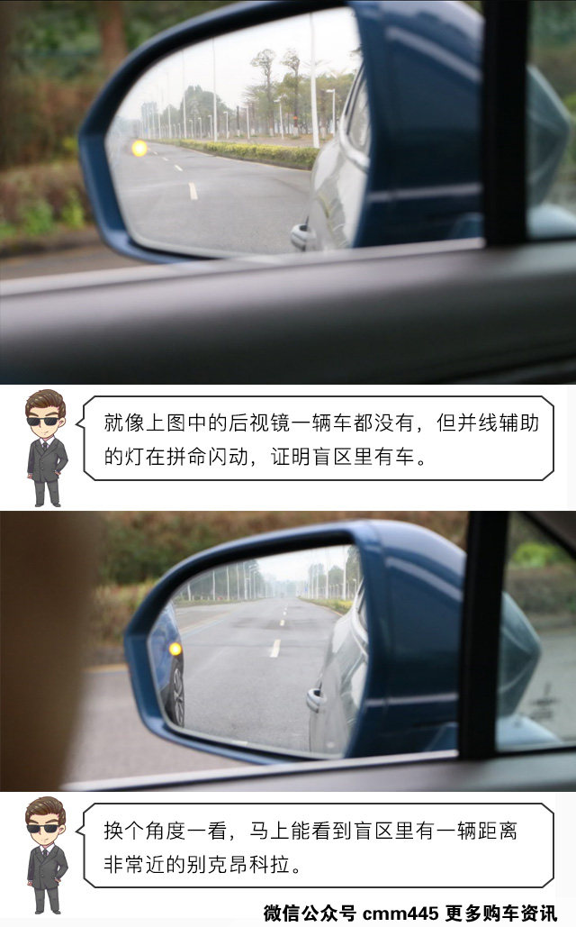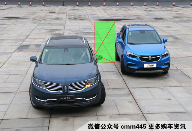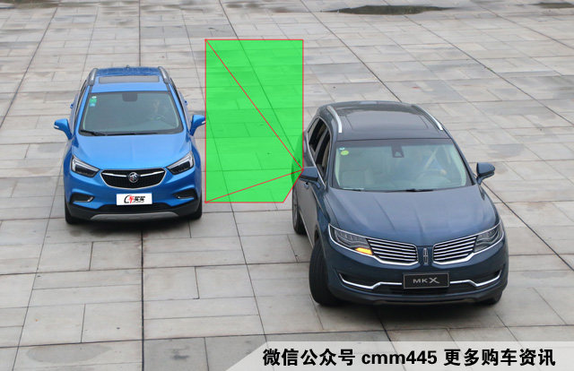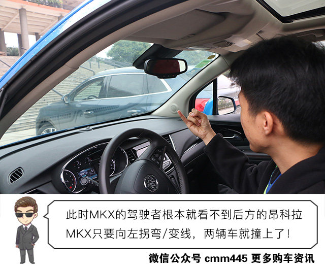我们再把车开到路上,当昂科拉在林肯MKX的侧后方行驶并且保持一定的距离时,MKX的车主一点都看不到身后的昂科拉!买买君的车祸就是这个原因造成的......