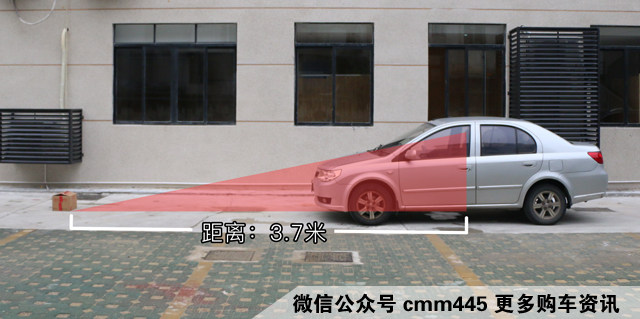 而我们找来一辆小轿车,以同样的方法得出小轿车的车头盲区距离只有3.7米!比上面的高大SUV短了近一倍!