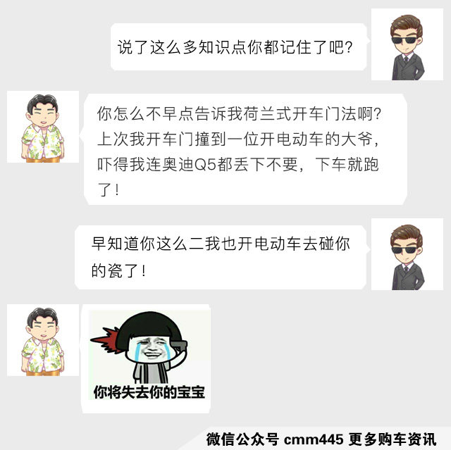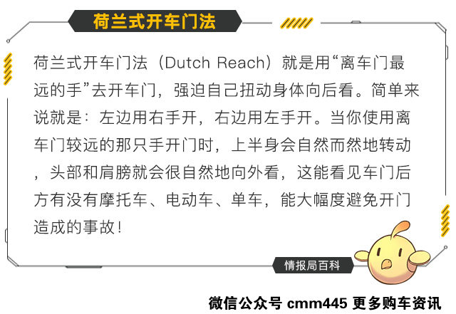而采用荷兰式开车门法用右手去开左车门的话头会自然往侧后方望去,从而看到后方来车,这样开车门的话,就算后面来10辆电动车都不会被您的车门撞倒!还可以避免被碰瓷哦。