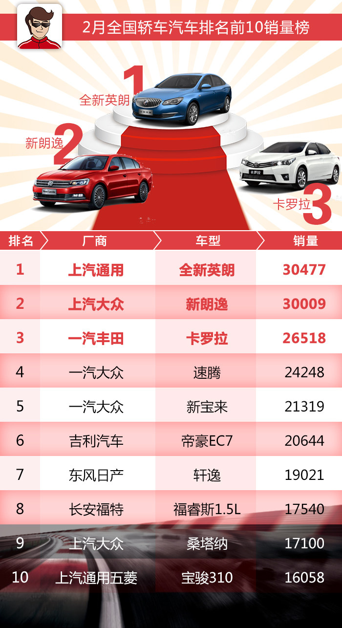 2.全新英朗继续保持稳定销量,其他车型销量下降,所以成为了2月份轿车销量冠军