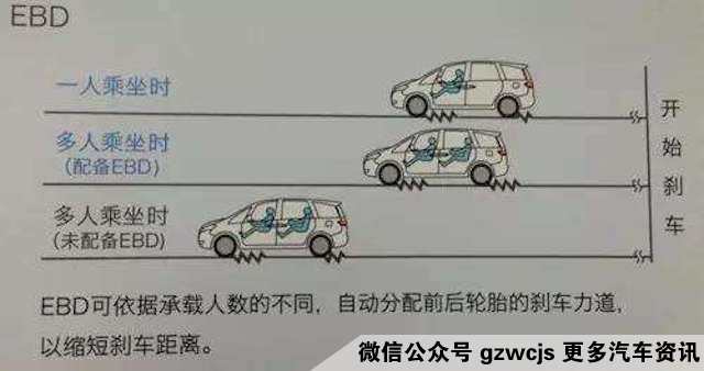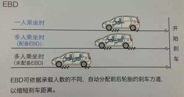 当发生紧急制动时,EBD在ABS作用之前,可依据车身的重量和路面条件,自动以前轮为基准去比较后轮轮胎的滑动率,如发觉此差异程度必须被调整时,刹车油压系统将会调整传至后轮的油压,以得到更平衡且更接近理想化的刹车力分布。