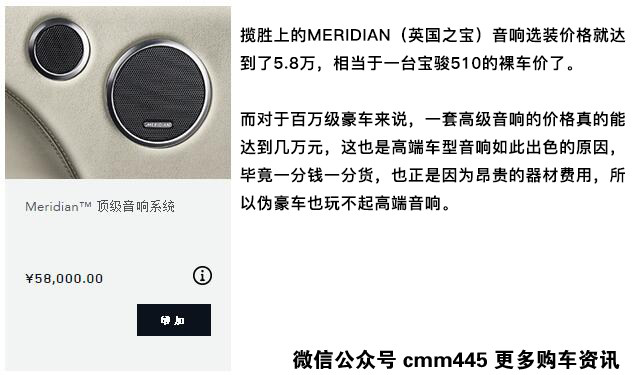 好的音响让人心情愉悦,但是好音响要付出的代价也是十分高的,揽胜使用了一套英国之宝的音响,扬声器的数目也非常多,甚至于后排空调出风口都带有扬声器,这套音响的选装价格达到了5.8万元,相当于一辆宝骏510的裸车价了。