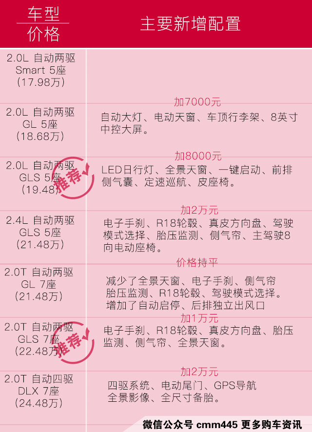 2.4L车型只有一款,而且只有5座,虽然动力有一定提升但是重量达到了1700kg,因此动力表现并不会有太多提升,小虎不推荐购买2.4L车型。