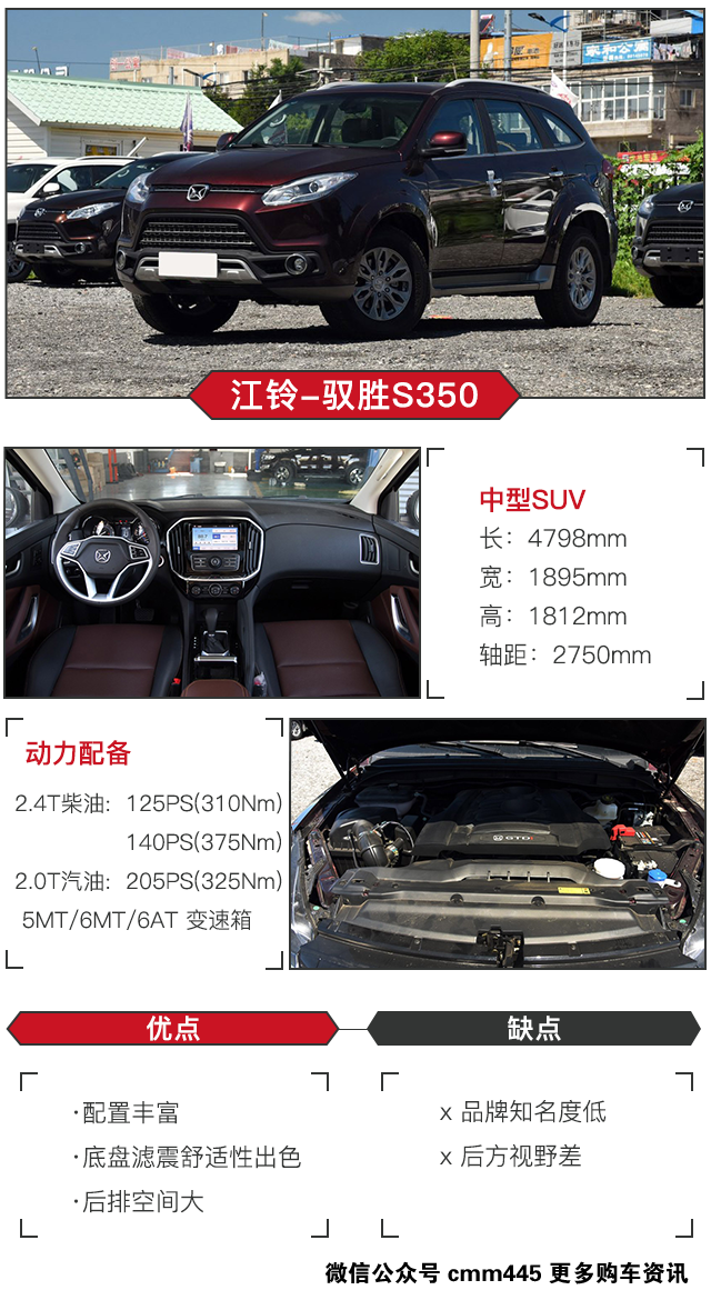 驭胜S350拥有非承载式的车身就不多说了,还有适时四驱+伊顿后差速锁,强悍的底盘表现面对非铺装恶劣路面完全不成问题,拥有不错的脱困能力。越野能力与外观的凶悍相得益彰,总的来说,这是一台日常乘坐很舒适,在恶劣路面开着也很有底气的车。