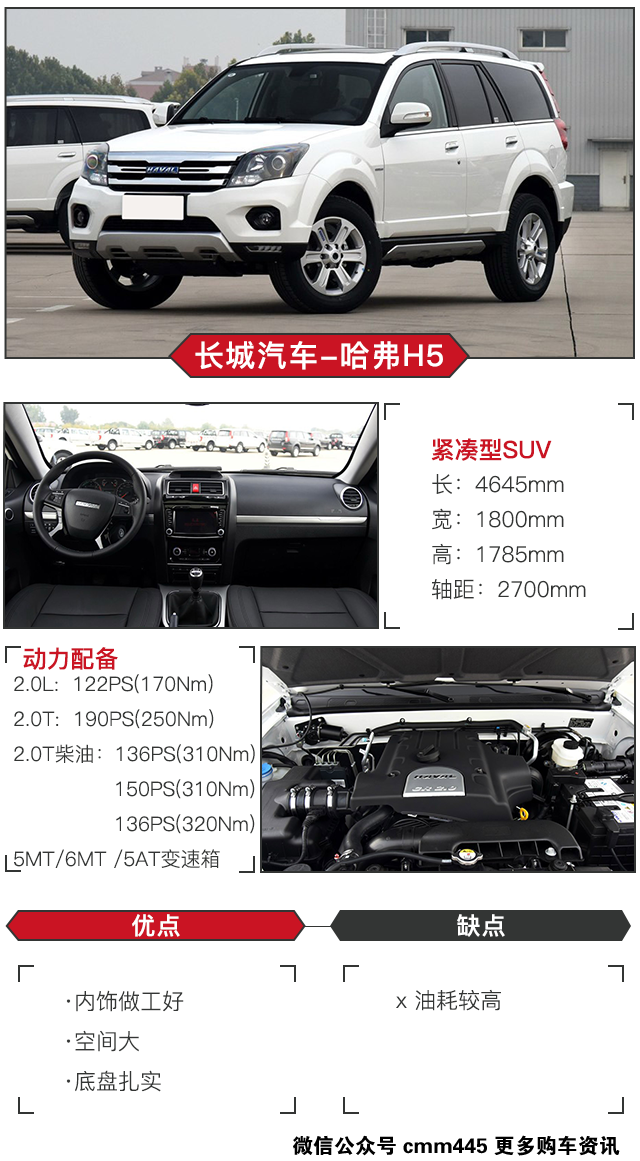 哈弗H5硬朗耐看,前进气格栅粗壮的镀铬条能给你很强的力量感。而且它有配备越野轮胎、车身稳定系统、四驱系统、昼间行车灯等,离地间隙还达到了225mm,加上采用了非承载式车身设计,底盘强度高,抗颠簸性能好,可以说是一台价格合适又靠谱的越野小能手。