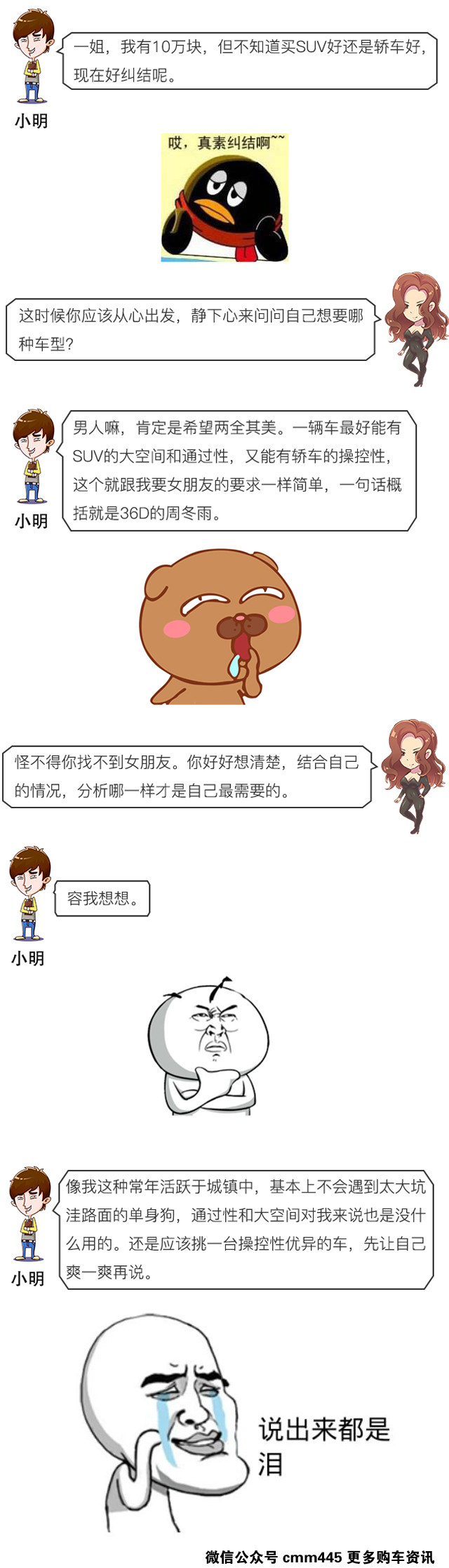 自从小明关注了车买买公众号以后,车买买每天推的8篇文章,他都仔细地浏览了一遍,迅速累积了不少汽车知识。然而,他最喜欢做的事还是撩一下一姐来探讨这个买车问题。