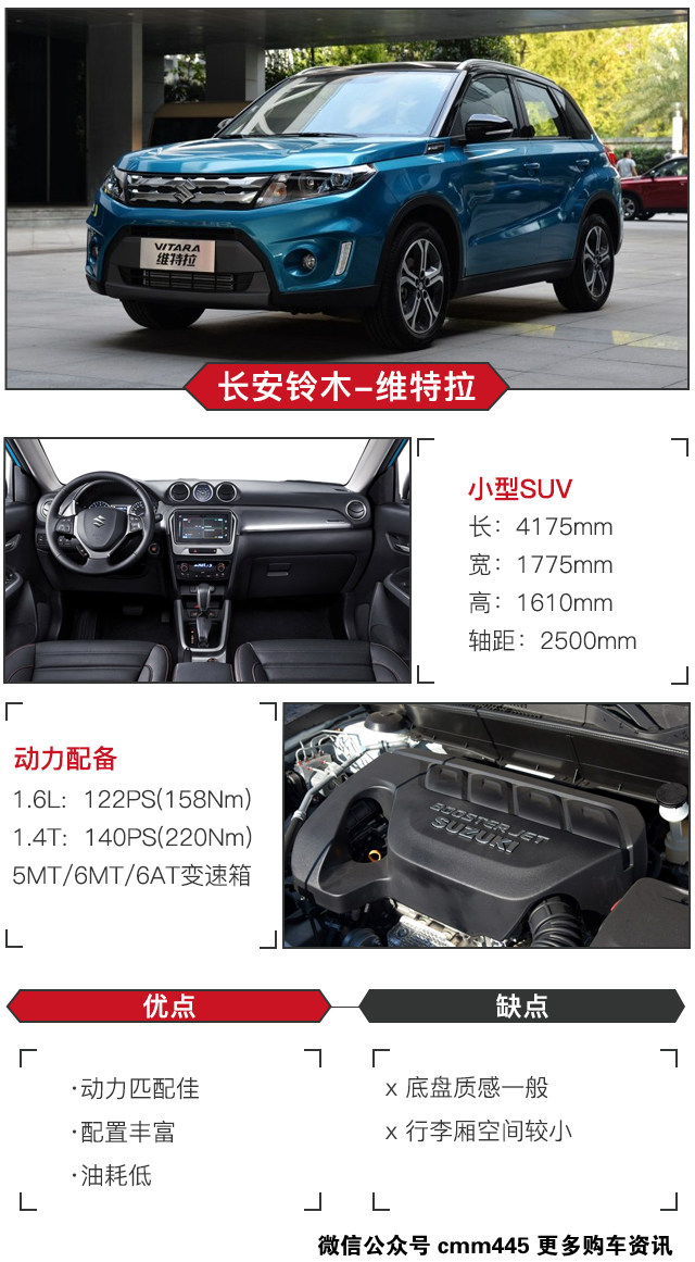 铃木是一个擅长于制造小型车的品牌,而这款维特拉可以说是铃木的满意之作,有着动力佳油耗低以及配置丰富的特点。不过它也有着一些缺点,首先依然是小型SUV上的隔音问题,其次是前门不易开关,隔音是比较好解决的,但前门这问题就只能多费点心思,体验较差。另外还有较多的车主反映导航系统的错误指示或者是地图信息丢失,对于这样一款以性价比著称的小型SUV实在是不应该,不过看在较多车主都是使用手机导航,这个问题也不算大,而且厂家可以通过软件升级去解决。