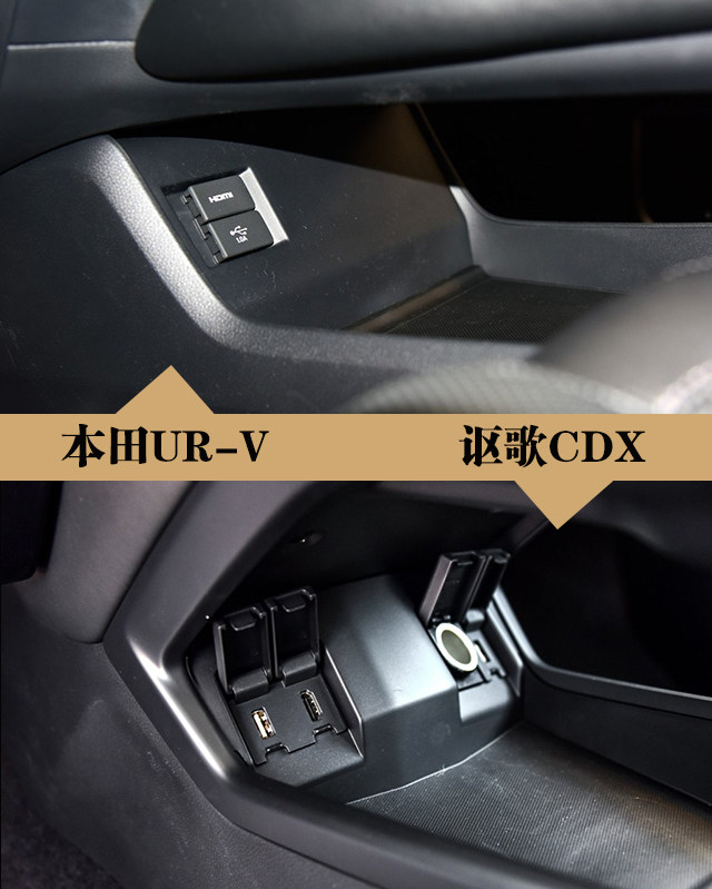 同时在储物空间和驾驶室空间上,本田肯定是尽其所能地将储物空间做得更多,将乘坐空间做得更大,在前排中控上,本田UR-V和讴歌CDX在挂挡下方都采用了镂空设计,并且配备有电源插口,可以供手机充电等。