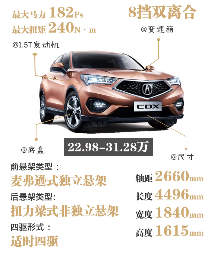 讴歌CDX则搭配了一款1.5T发动机,与思域型号相同(代号为L15B9),但调校出来的峰值扭矩更大,达到240牛米,匹配8速双离合变速器,本田为了弥补双离合变速器的顿挫现象,还在该变速器里面加多了一个液力变矩器(传统自动挡变速箱都有),当车辆在低速行驶时,车辆能够利用液力变矩器传动的柔和性,让车辆低速蠕动变得更加平顺,而当高速介入时,双离合变速器又会介入工作,换挡变得更快,传动效率更直接,而且在底盘上,讴歌CDX还装载有可变悬架,能够进行软硬调节,这可是UR-V所没有的地方。