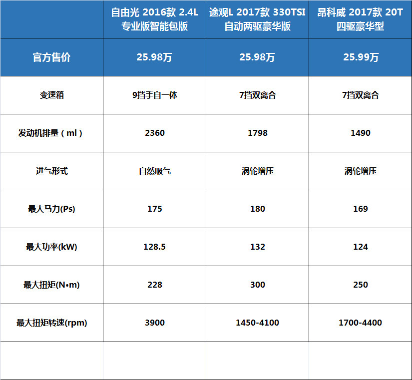 途观L 330TSI版本没有四驱暂不讨论,自由光 2.4L 专业版智能包和昂科威20T 四驱豪华型都是四驱版本。