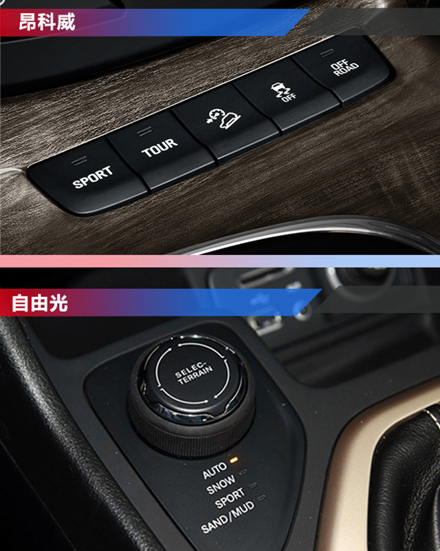 其中昂科威的多种驾驶模式分为“运动、旅行、越野”3种,分类比较常规,更复杂的路况没有专门的调教。而自由光的Selec-Terrain路况模式自选系统更为详细,含自动、运动、沙地/泥地和雪地四大驾驶模式。