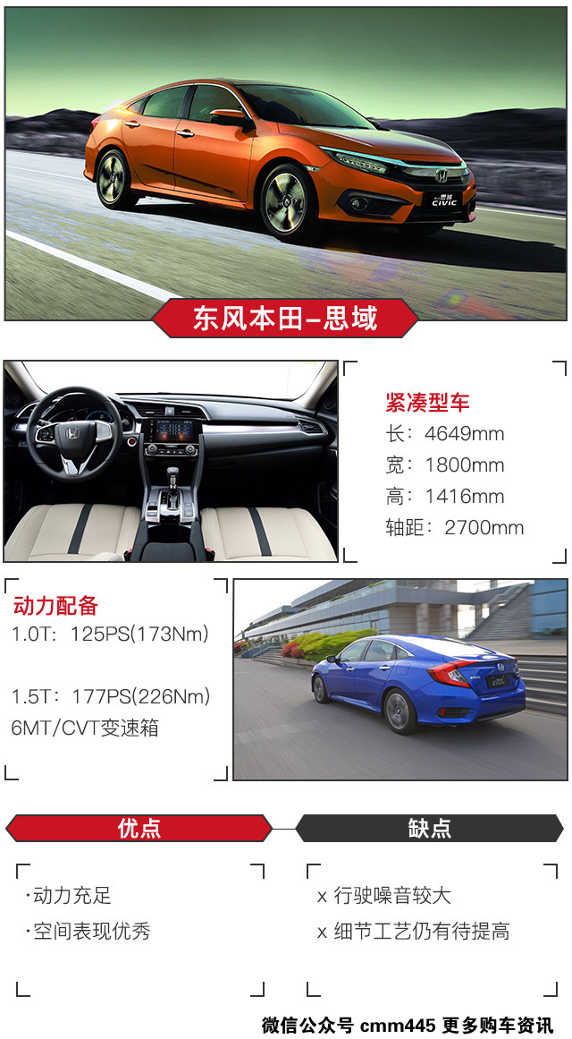 动力强,空间大;相信很多人都会想到思域吧;确实,十代思域的进化相较于上一代来说是彻底的,地球梦的发动机动力充足、CVT变速箱响应迅速、燃油经济性出色;本田一贯的偷空间手段攫取出非常宽敞的车内空间,再加上轿跑化的外观和跑进8秒的百公里加速成绩,高动力家用车给思域一个位置并不为过。