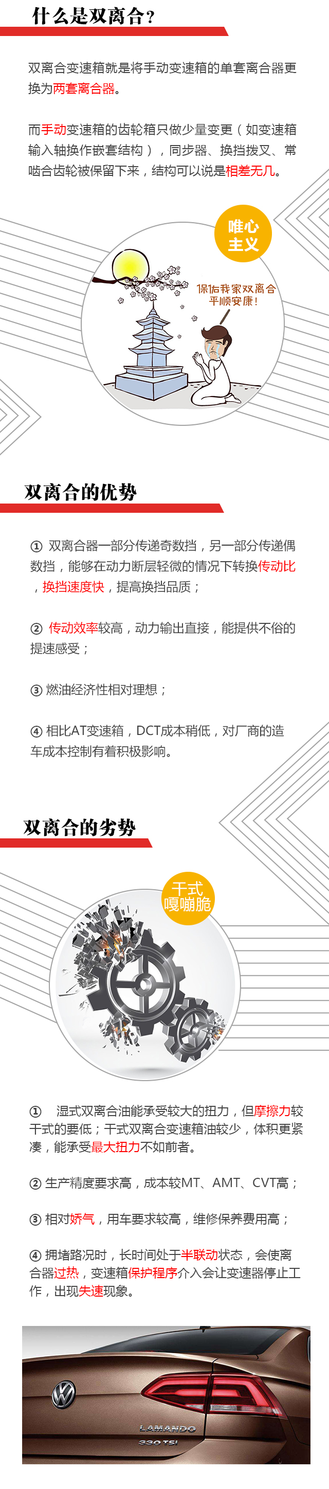 总而言之,半联动次数越多(拥堵路况走走停停)、蠕动时间越长、强度越大(暴力起步、长时间坡道起步),双离合变速箱使用寿命就越短,求神拜佛亦于事无补。