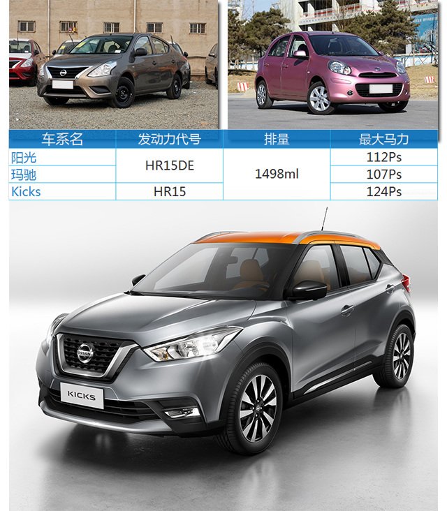 从申报信息来看,Kicks将采用代号为HR15的发动机,排量为1.5L,在售的日产车里面,阳光和玛驰也是使用1.5L发动机的,但它们采用的是代号为HR15DE的发动机,最大马力只有107Ps,而Kicks上的HR15发动机最大马力则达到124Ps。这对于想买这款车的人来说是好消息。