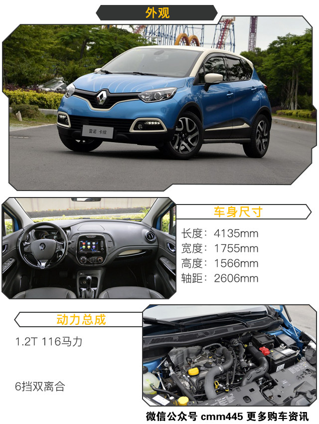 雷诺卡缤这款车大家似乎有些陌生,但是它给你的第一印象是很不错的,外表够个性,外观内饰均可享受独特的“私人订制”服务,车身颜色和车顶颜色可以自由组合,还可以选择各种各样的个性贴纸,最适合那些追求时尚个性化的消费者了。