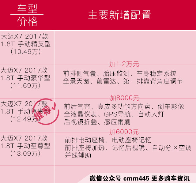 大迈X7日前正式上市,价格10.49-13.09万元,这款中型SUV前期上市的4款车型全部为1.8T发动机+5挡手动变速箱的动力组合,想要自动挡的朋友还得再等等才行。